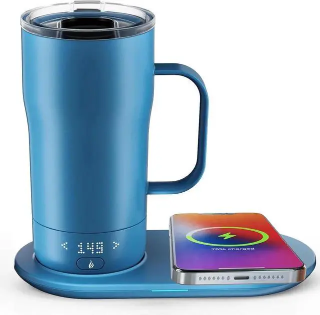 Smart Self Heating Coffee Mug 18 Oz Temperature Control Heated Coffee Mug App Controlled Warmer Mug 5-10 Hour LED Display Keep Coffee Hot All Day Fast Wireless Charger Base Lake Blue