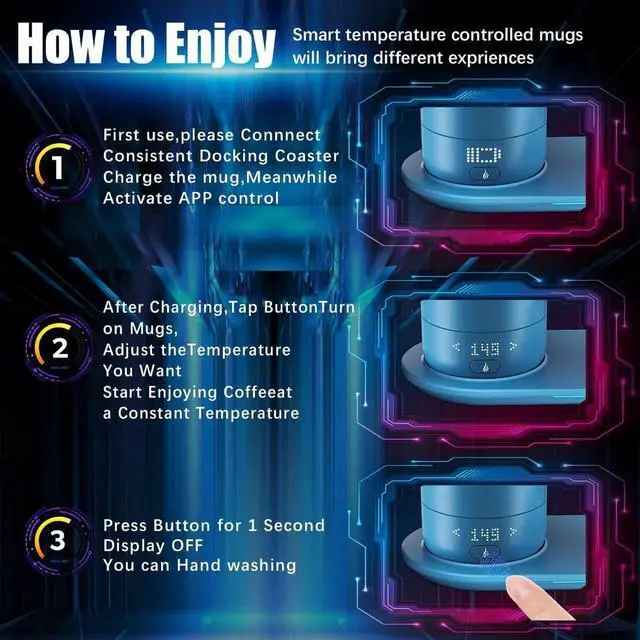 • Manual and App-Controlled Rechargeable Temperature Control Smart Mug has an on/off time preset function on APP. This self warming coffee mug has two methods of temperature control for you to choose from.You can adjust the temperature directly through the touch button on the smart coffee mug and the APP on your phone.The included sliding lid also brings you more convenience. You can drink hot coffee anytime, anywhere.