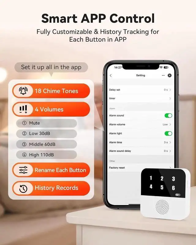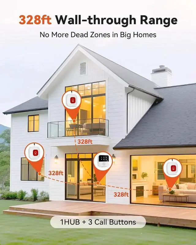 328ft Wall-through Range1 Hub+3 Buttons w/ 433MHz, penetrates walls, kills dead zones.
