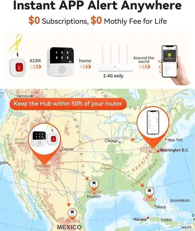 APP alert anywhere - No subscriptions needed! SMS/call/email require optional plans.