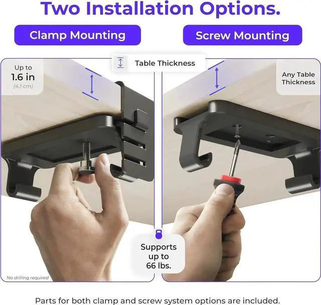 It is very easy and convenient to set up this tray: you can use either the clamps or screws provided in the pack. There is no need to drill holes into your desk. The clamp is very sturdy and durable