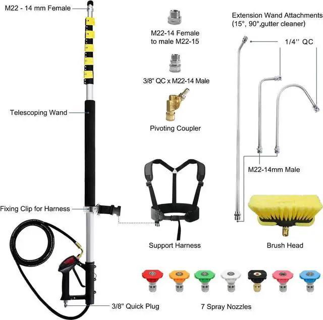ESSENTIAL ACCESSORIES - The brush head cleans the most stubborn dirt with jets; 3 lengthened tension wands (15°, 90°, gutter cleaner) are ideal for cleaning various places; 7 spray nozzles meet your cleaning needs; Pivoting coupler can adjust jet direction; Lengthened support belt helps reduce strain on your back and arms.