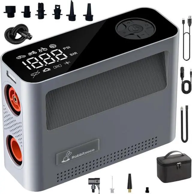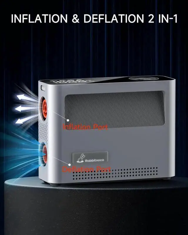 - [RABBITXOCO 2024 Electric Air Pump] Air pump built-in 120W high-power motor at the same time using dual pumps for inflating and deflating, 4X inflate speed air inflator 500L airflow per minute for 0~150PSI full range of air pressure, 30~50 seconds to fill a variety of balls, 1~2 minutes to fill a variety of models of tires, 2~3 minutes to fill the air beds, tents, 10-15 minutes to full paddle board, kayak.
