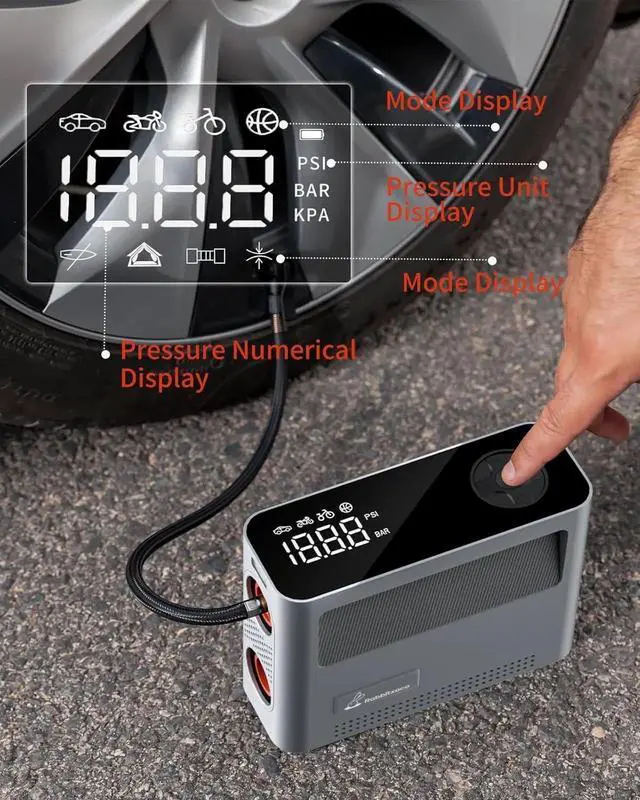 [Smart Air Pump] Electric tire pump built-in 3 * 2600mAh lithium batteries can work continuously for 1 ~ 2 hours, fully charged in just 3 ~ 4 hours, equipped with a traditional cigarette lighter charger and Type-C fast charging interface two charging modes, whether at home or traveling, it can always solve your inflatable problemfalse[SUP Air Pump] Air pump for inflatables has 7 preset inflation modes suitable for different inflatable equipment, 1 mode can be deflated with one key, while you can manually preset the pressure parameters. LED digital screen can display real-time pressure value and preset pressure value.