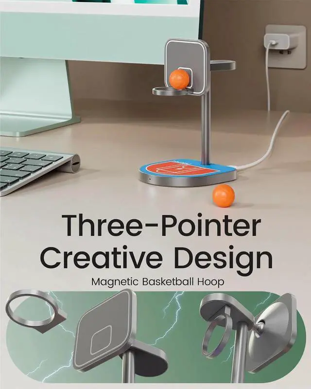[What You Will Get] 1 * X85 3-in-1 Magnetic Wireless Charger, 1 * 30W PD Fast Charging Adapter, 1 * Magnetic Basketball Hoop, 2 * Mini Basketball, 1 * USB-C to USB-C Cable, 1 * Magnetic Ring (Extra compatible with Non-Mag Safe QI Phones), 1 * User Manual. Perfect for basketball fans or anyone looking to add some joy to their daily routinean excellent gift for birthdays, holidays, or just because!
