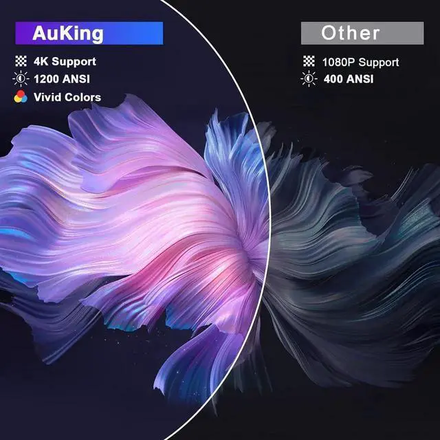 - [1200ANSI & 4K Support, Detail-first Visual Feast]This projector features 1200 ANSI lumens and supports input, ensuring crystal-clear images with stunning detail. With advanced LCD Pro and color reproduction technology, AuKing video projector is at least 98% brighter and clearer than other 1080P projectors, delivering natural light and dark filtering along with sharp contrast, enhancing realism and vividness in every scene.