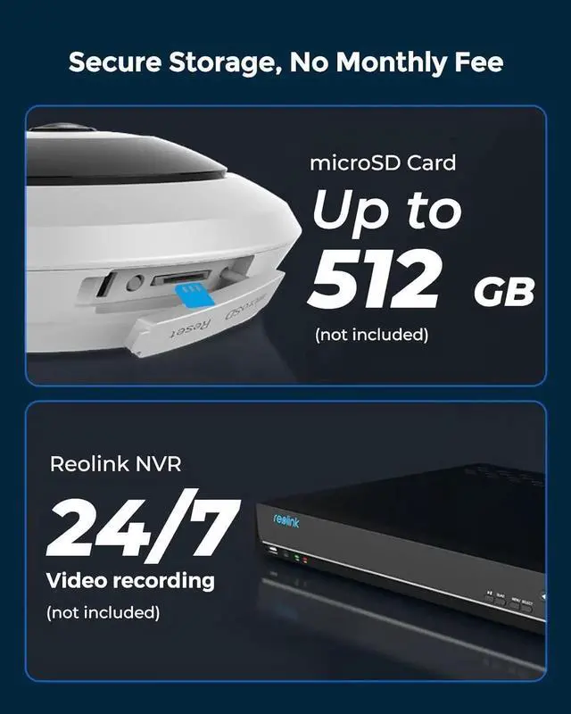Secure Local Storage Options: Home Security Cam supports up to 512GB microSD card and NVRs (both sold separately). Playing back stored videos is easy with smart event filters, and no subscription fee is needed.