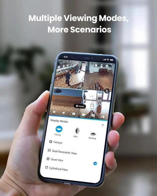 6MP 360° Panoramic WiFi Indoor Camera1 Panoramic Camera = 4 Ordinary CamerasSave your cost by using one panoramic camera instead of four regular cameras. Use the quad view mode and adjust the focuses to four different spots you care about just like having four cameras in one room! More viewing modes are available for you to explore in more scenarios.