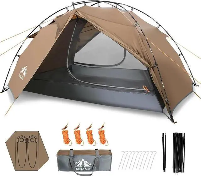 Tear-stop Material and Waterproof: 210T Tear-stop fabric with waterproofness PU 3000mm, waterproof tape on every seam, ensures the inside hiking tent is totally dry under any rain situation even in the storm. Aluminum Pegs, guylines make this 4 seasons tent stable in a windy day