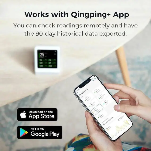 - Smart Wi-Fi Device, Supports Qingping+ appYou can monitor the 7 metrics remotely in Qingping+ app when the device is connected to 2.4GH z or 5GHz Wi-Fi. You can also check or export the historical data of the last 30 days. The product supports firmware upgrades for new features and optimization.