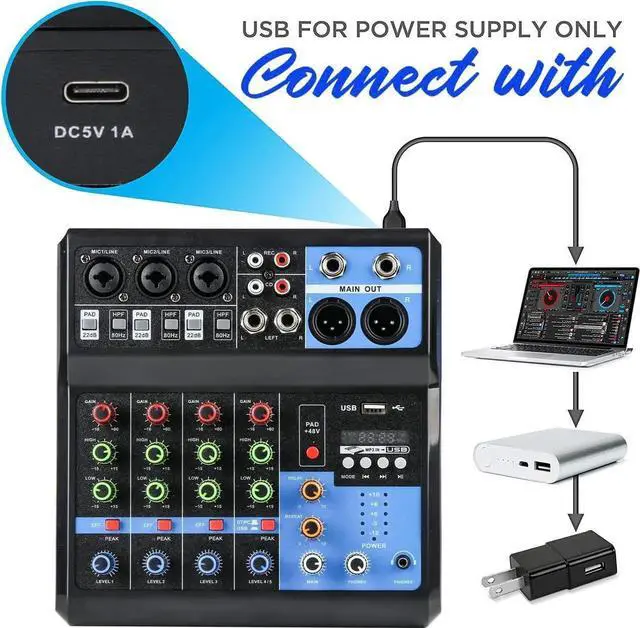 - This multi-function mixer has Bluetooth playback function and built-in controls to provide play/pause, skip tracks and mode switching experience. The DC5V power supply interface can be directly powered by a power bank, which is more convenient to use when there is no power supply.