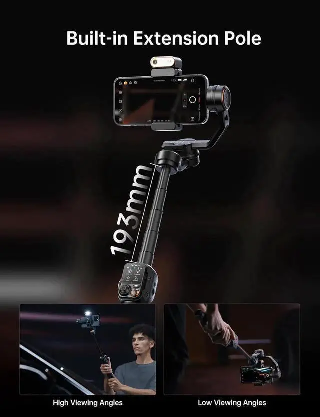 - Built-in 193mm Extension Pole: The Hohem iSteady M7 gimbal stabilizer for smartphones adds a 193mm built-in extension rod, which can simulate the drone's shooting view at a high angle, and shoot the horizon image at a low angle, shooting a blockbuster with the built-in extension pole!