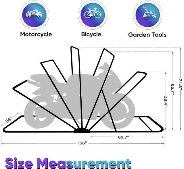 Roomy Vehicle CoverThe dimension of outdoor motorcycle storage shelter is 136" x 54" x 75" that is large enough to accommodate a variety of motorcycle models, even Harley bagger, ect.