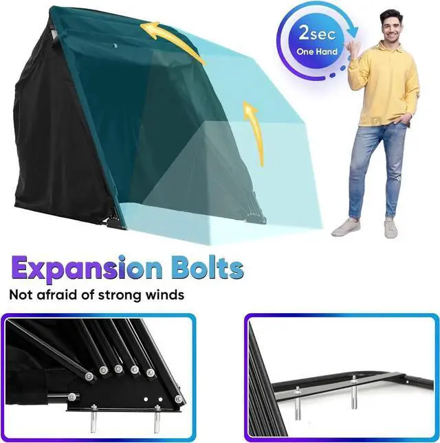 Stable & WindproofThe motorcycle storage shelter comes with 10 expansion screw to secure the shed to the ground to prevent it from being blown over by side winds