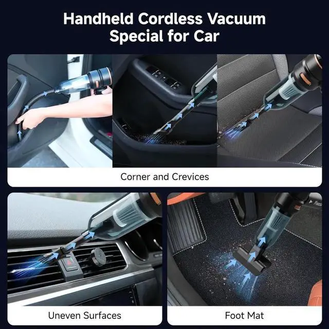 Rechargeable Battery and Fast ChargingThe hand held vacuum cordless cleaner has a built-in 6000mAh battery with a fast charging port, and can be used for about 35 minutes. It supports type C charging and can be easily charged with a car charger, mobile power, laptop, rechargeable battery and other methods, quickly fully charged in 4 hours with 5V/2A adapter.