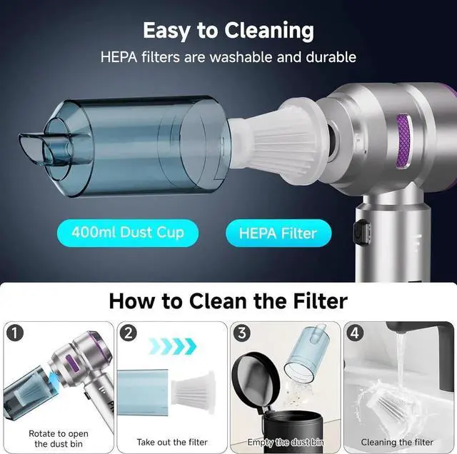 Reusable and Washable HEPA Filter It comes with 1pc HEPA filter, which filters fine dust during use and can be easily washed and reused. It also comes with a large capacity 400ml dust cup. The transparent design allows you to clearly see the dust collection process and reminds you when it needs emptying. It's easy to swivel and detach for easy emptying. The swivel snap design is safer so you don't have to worry about dust spilling out.