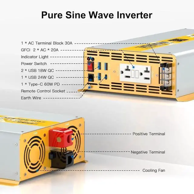 - LED SCREEN & REMOTE CONTROLLER Icons on LED can directly show the running state of products quickly and accurately display abnormal problems. The rich accessory package allows you to use it freely. Inverter includes 2 120V GFCI AC output ports, 1 AC terminal board, 1 USB port 5V 2.4A, and 1 type-c port. Box contains 2 2.62 ft 1AWG positive and negative battery cable clips, a 1.64 ft ground wire, and 2 40A 32V fuses.