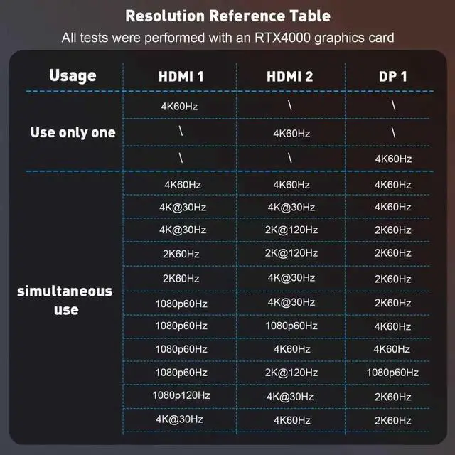 DP Input Multi-Screen ExpansionConnect the graphics card through the DisplayPort (DP) interface to support the expansion of 1 DP signal to 2 HDMI and 1 DP display, to achieve three-screen synchronization or split-screen display. Minimum requirements support 18Gbps bandwidth graphics card connection, the highest resolution can be up to 4K@60Hz, to meet the needs of design, gaming, multi-tasking office and other scenarios.