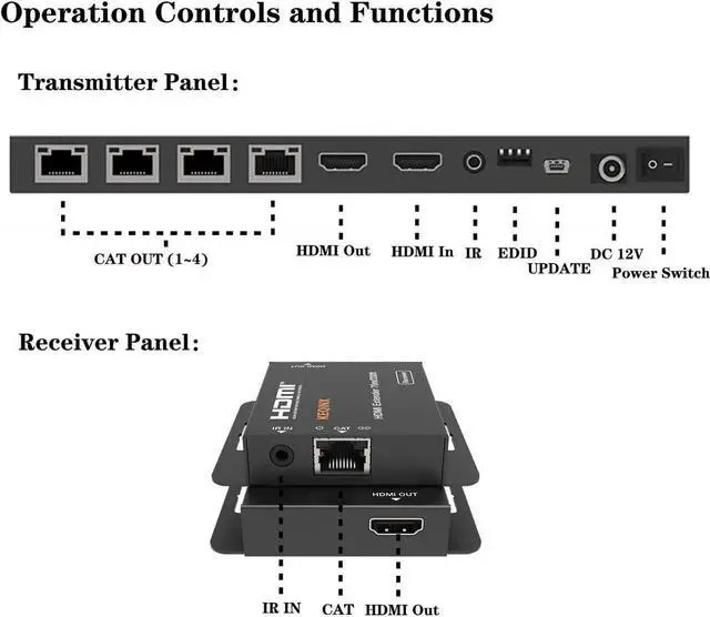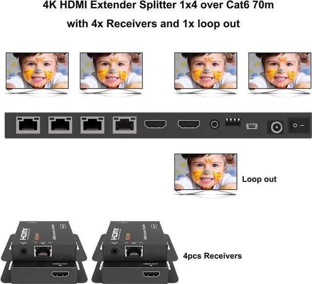 5. Support 1 HDMI input, 1 HDMI loop output and 4 CAT outputs.