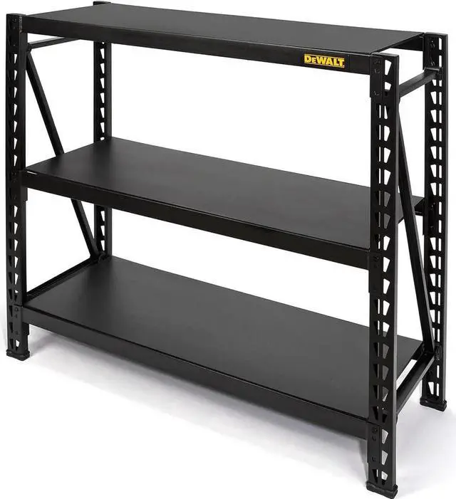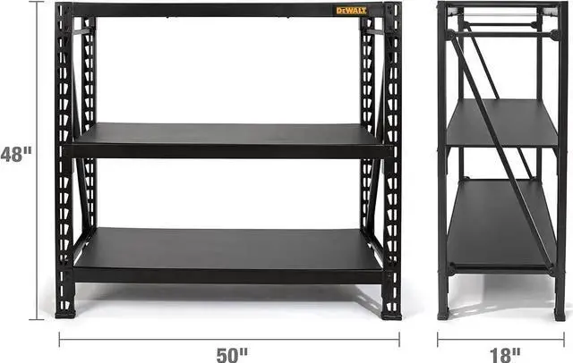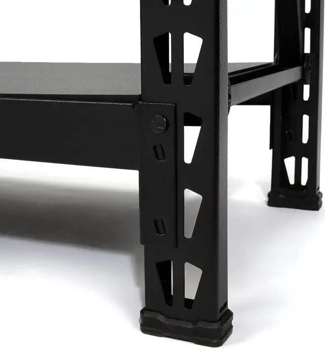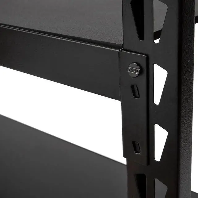 The DXST4500BLK 4-Foot Tall, 3 Shelf Industrial Rack was designed and engineered to provide heavy-duty, professional ll storage. industrial racks such as solid laminate decks, safety straps with weld nuts for ease of assembly, and top caps that protect both you and your items from possible damage. The three black laminate wood composite decks can each support an nly distributed 1, 500 lb. for a total of 4, 500 lb. The uprights, crossbeams, and support straps are all made from powder-coated steel and are designed so that once assembled, each shelf has two types of support straps in addition to the crossbeams to prnt them from buckling under pressure. The shelves are adjust in 2.35 -inch increments and the locking pins ensure that each shelf is properly installed. Glass-filled nylon feet on the uprights protect the powder coat from damage when repositioning the rack in addition to providing a second layer of protection against unwanted moisture and liquid spills while also protecting finished floo from damage. Each rack also includes 2 st plates so you can easily and securely join two racks together vertically or, thanks to the double row design of the uprights, connect them together horizontally to create a complete storage or workspace solution customized for your needs.