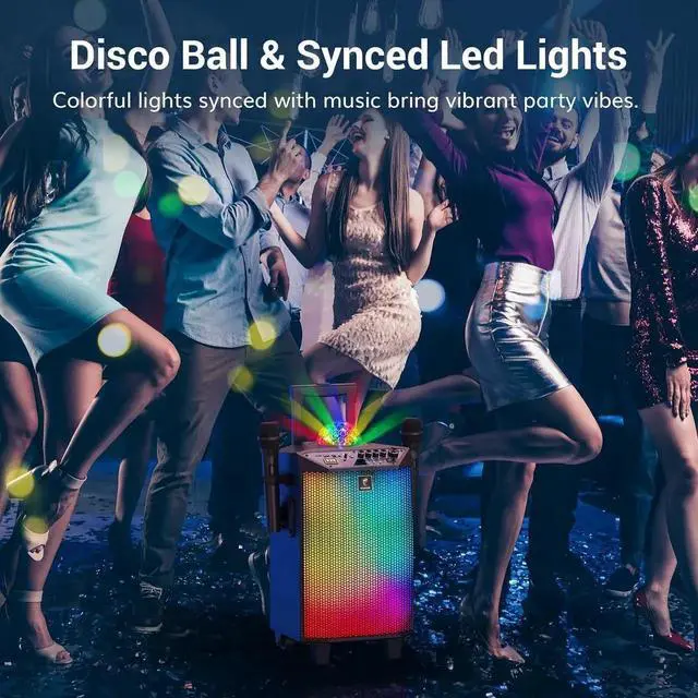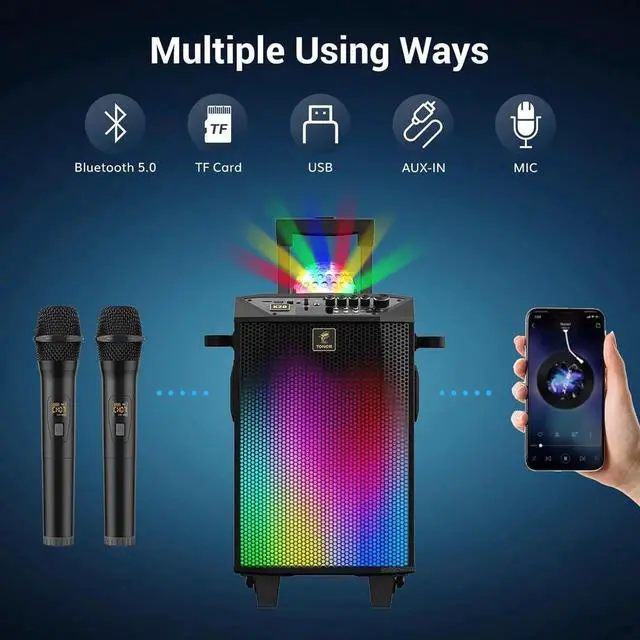Connect: This karaoke machine for adults features the latest Bluetooth 5.0 chip, ensuring instant pairing, more stable transmission, and extended range. This karaoke machine also supports Micro TF cards, USB, and AUX inputs. making it compatible with Android phones, TVs, iPads, tablets, PCs, and more. The included high-quality wireless microphones have a signal transmission range of up to 100ft, which suits large gatheringsUltra-long