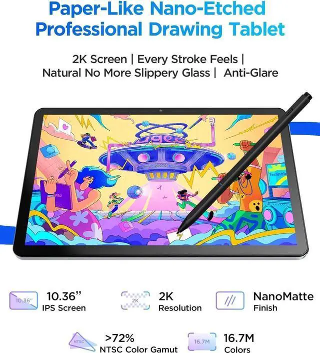 10-inch 2K Artist Tablet with Eye Protection: The pad with an 100% sRGB color gamut colors appear vibrant and true-to-life and 2K Resolution (2000×1200, 277PPI) for Studio-Quality Detail (sharper than standard FHD) reveals fine brushstrokes, intricate linework, and subtle gradients, The UT2 features a nano-etched matte glass screen, reducing glare, minimizes strain during marathon creative sessions, whether youre designing logos, animating, or taking notes in a dimly lit studio