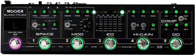 TAP TEMPO: These analog modules are complemented well by a multi-modulation pedal and a digital ambience engine, simply named SPACE. Which consists of a high quality digital delay and a stereo reverb. Both of these digital modules are fully controllable by the dedicated tap tempo control footswitchfalseBuilt-in precision guitar tuner: The Tuner in BLACK TRUCK has been improved over that of RED TRUCK with a brand new tuning algorithm that delivers faster response and greater tuning accuracy than ever before.