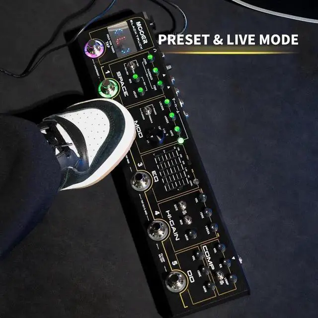 Connections: Dedicated direct output with speaker simulation and an independent volume. When used in conjunction with the integrated loop switcher, BLACK TRUCK can very easily be programmed to provide one step preControl for connection to a mixing desk, computer or headphones The Black Truck, Includes a carry case for easy transportation, the black truck did not come with a power supply. Recommend the MOOER PDNW-9V2A-US power supplysets- MOOER Black Truck has two different operation modes. You can easily change the operation between LIVE MODE and PRESET MODE. Bringing 6 effects pedals built into 1 simple unit with Compressor, Overdrive, Distortion, EQ, Modulation, Delay/Reverb.
