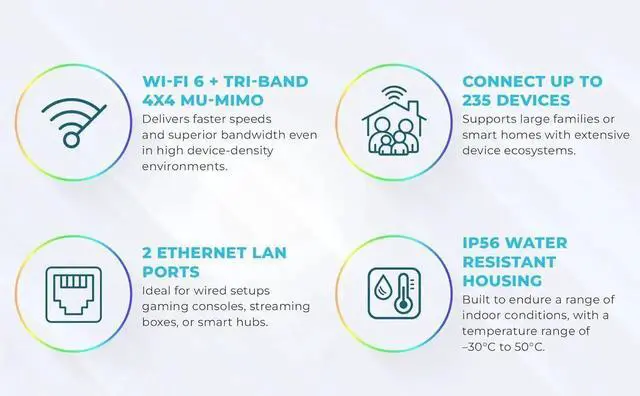 Key Features & Benefits: Next-Gen Wi-Fi 6 Tri-Band 4×4 MU-MIMO for faster speeds & better multi-device performance Up to 3,200 ft² coverage and supports 235 devices simultaneously Mesh-ready pairs with Starlink Gen 2 & Gen 3 nodes for expanded range Compatible with all Starlink dishes including Standard, High Performance & Gen 3 Dual Ethernet ports for stable wired connections Durable & reliable IP56-rated, operates from 30 °C to 50 °C Easy Starlink app setup with real-world speeds of 100300 Mbps Perfect for streaming, gaming & smart homes