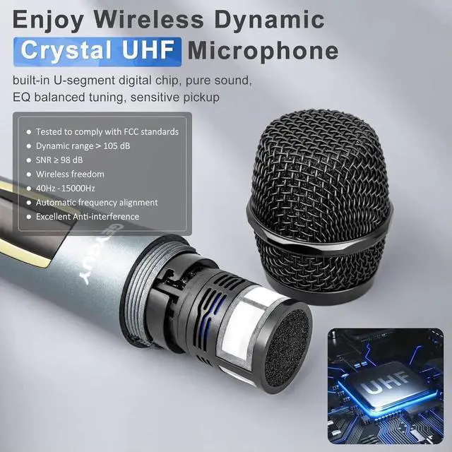 - Dual Wireless Microphones No Interference, Just Sound Includes two wireless microphones with anti-interference digital chips and advanced dynamic balancing. Whether you're on stage, teaching, or karaoke singing, this microphone and rechargeable speaker combo ensures crisp, stable audio.