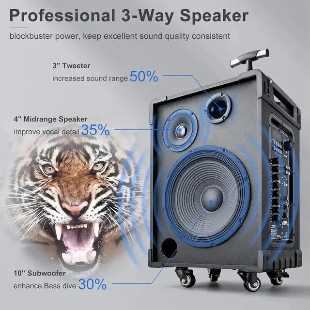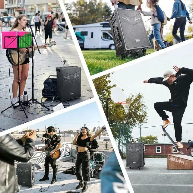 - Easy to Move, Built to Party Designed with portable wheels and a top handle, this portable Bluetooth PA system is ideal for outdoor wireless speakers for parties, church, or tailgates. Rechargeable battery keeps your event going anywhere.