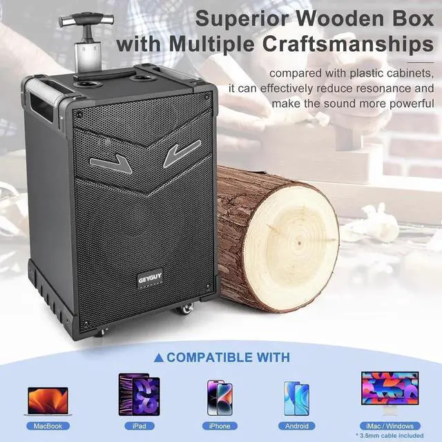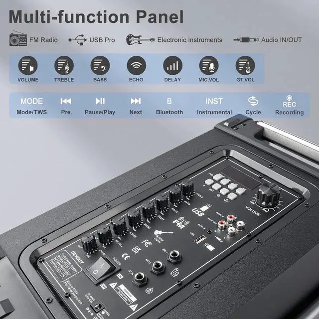Seamless Bluetooth & TWS Audio Link Stream music wirelessly via Bluetooth 5.0. For stereo sound, pair two GTSK10-3 units using the TWS function, turning your setup into a full wireless speaker and microphone system for outdoor or indoor use. false Multi-Function DJ Setup Ready Plug in your electric guitar, tweak mic tone with independent EQ (mid/high/bass), or play tracks from USB (up to 512GB). Compatible with formats like MP3, FLAC, APE, WAVE, and WMA. This PA speaker system even supports FM radio for extra versatility. false Easy to Move, Built to Party Designed with portable wheels and a top handle, this portable Bluetooth PA system is ideal for outdoor wireless speakers for parties, church, or tailgates.