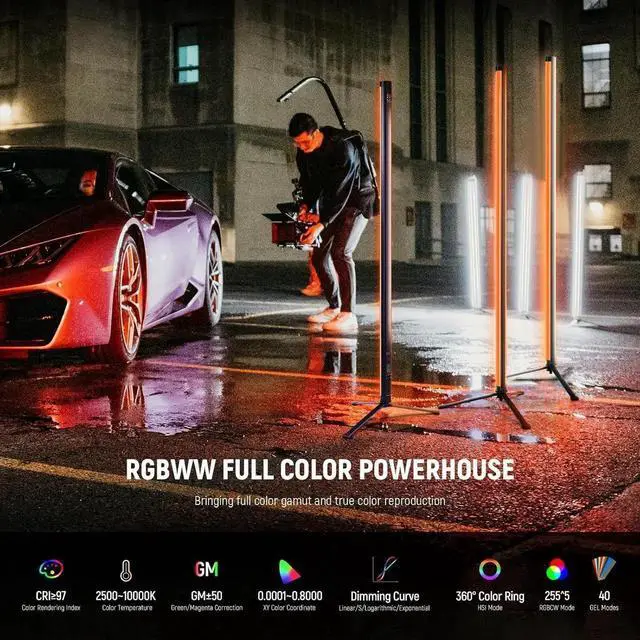 Mesh with Other Lights When controlled by 2.4G or APP, the TL120C can mesh with TL60/BH30S/CB300/CB300B/CB200/CB200B/FS150/FS150B/FS230 and other LED video lights for elevated light effects, perfect for advertising, filmmaking, television production, music videos, and more. You can mount it on the CTN5 Light Stick Stand, or connect it to a DMX console with NC005/NC006 RJ45 to XLR C Set
