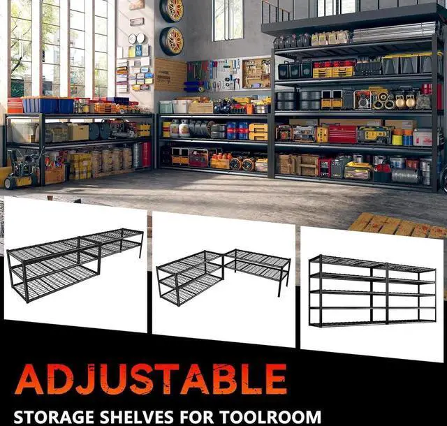 Adjust Heavy Duty Shelving to Meet Different NeedsYou can use your imagination to customize your own space. Heavy duty shelving is designed with adjust connectors. The height of each layer not only adjust by moving the crossbar meet the different heights of needed, but also the shelf can be assembled or disassembled into sral different metal shelving. Two horizontal racks can be used as workbench can be used for garage storage shelf
