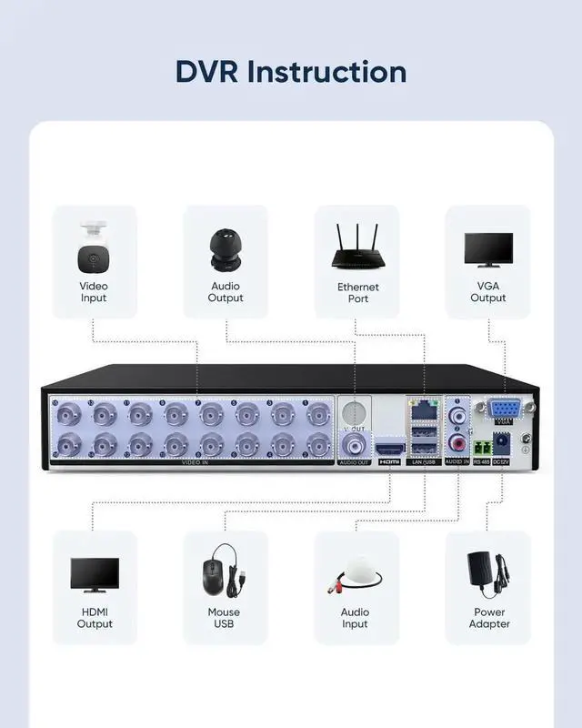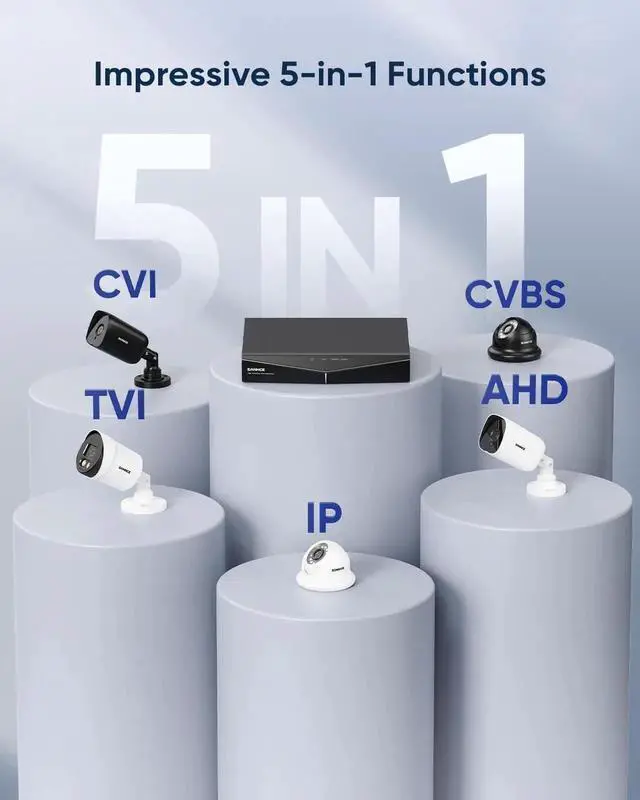- [Powerful 5-in-1 DVR]- The hybrid digital video recorder works with TVI, AHD, CVI, CVBS analog and IP security cameras (up to 1080p Full HD resolution). You may add any type of security camera you want to this DVR for 24/7 recording.