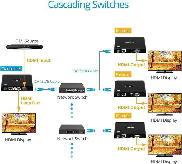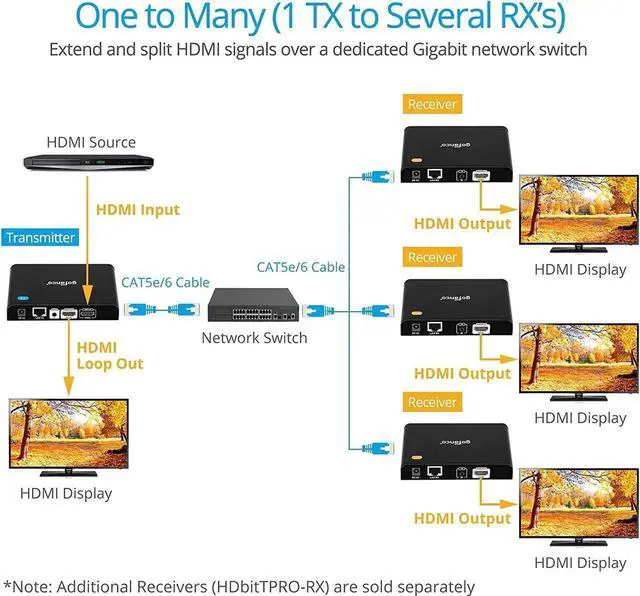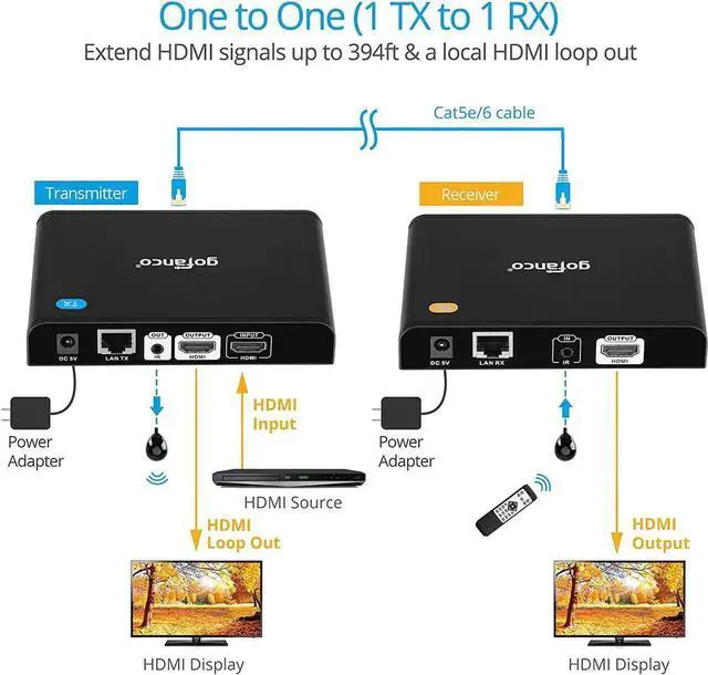 HDMI LOOPOUT HDMI Transmitter is equipped with 2 port HDMI splitter; Additional HDMI output on the Transmitter to connect to a local display for monitoring. Supports IR extension, allowing source device to recognize remote commands