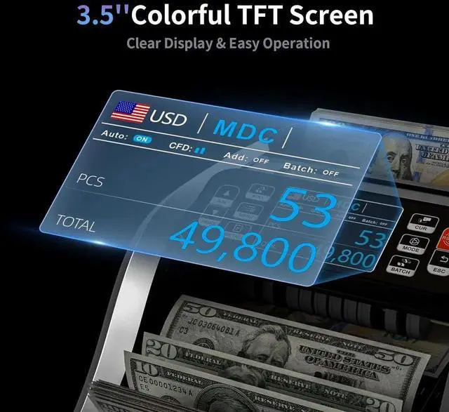 Clear Dual-Screen Display: The 3.5 TFT screen, featuring advanced LCD technology, delivers sharp and easy-to-read visuals. The external monitor provides dual viewing angles, allowing both operators and customers to view counting data effortlessly.