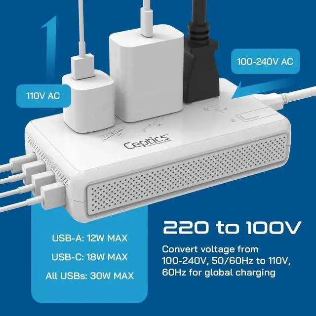 - [Travel Voltage Converter with USB-C]: Ceptics converter for european travel features 4 USB ports, 1 USB-C with PD 18W fast charging for smartphones, tablets, and other gadgets and a separate 2000W outlet specifically designed for hair dryers and other heavy-duty devices.