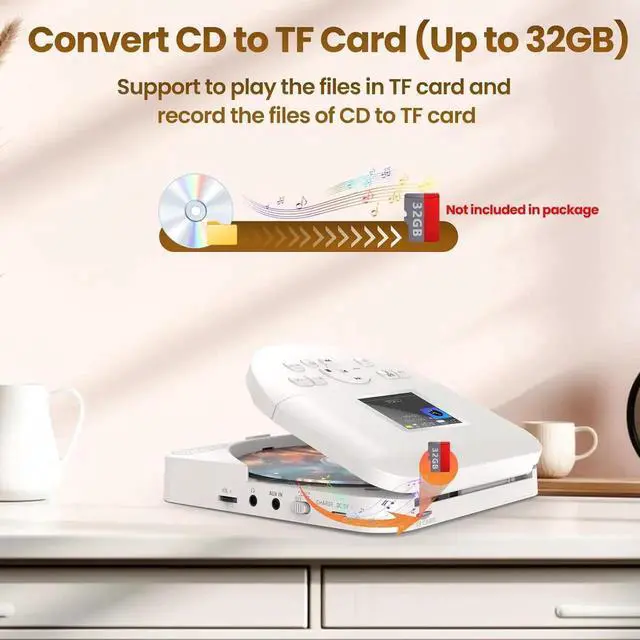 Different Playing ModesThis small cd player has different playing mode. It supports to use TF card (micro sd card), FM TX and Bluetooth. You can use it in different scenarios. The REC function can rip CD content to TF card, so you can play your favorite songs even if your forget to bring the CDs. (TF card is not included in the package)