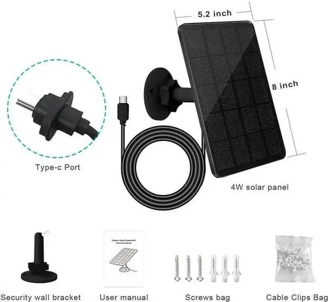 Packing List: 2* solar panel, 2*360° adjustable wall mounting bracket, 2* waterproof rubber plug, 2*screws bag, 2*cable clips bag, 1*user's manual.
