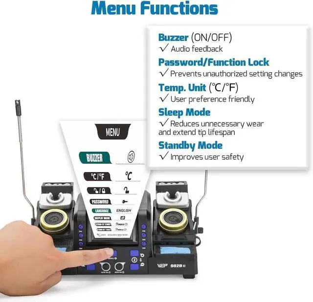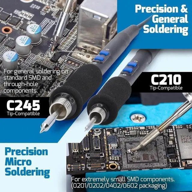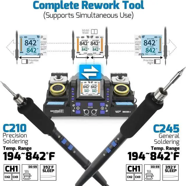 2-in-1 Micro Solde Station: Use Type-210 micro solde iron and Type-245 precision solde irons simultaneously; adjust temperature 194°F~842°F; slim tips for precision micro solde under a microscope