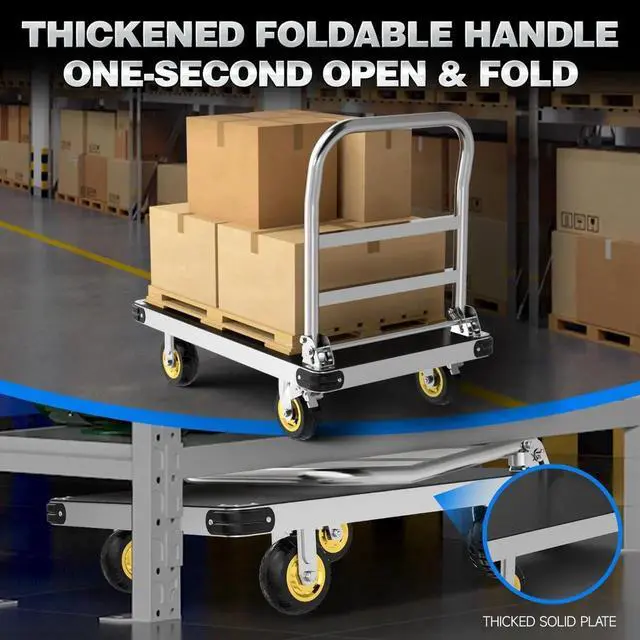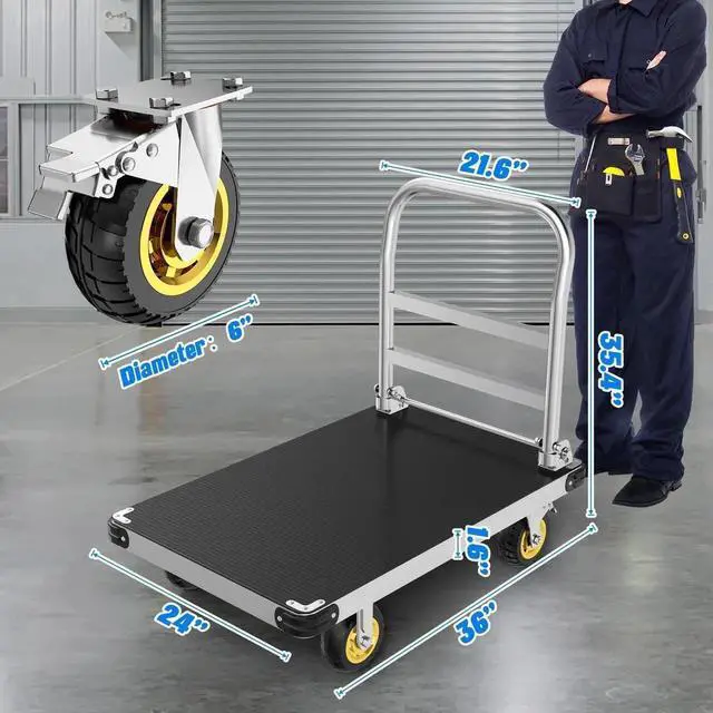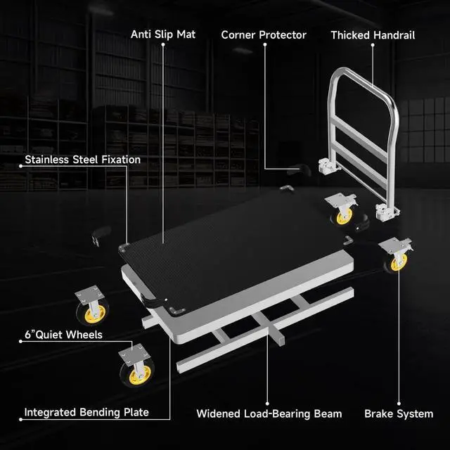 Non-slip Mat & Durable: Anti-collision bars have been added to the four corners of the platform dolly to prevent collisions that might affect your feet. The included rubber mat not only protects the cart's surface but also prevents items from slipping, ensuring a secure transport experience. The platform truck's border and bottom are fortified with multiple bends, adding structural reinforcement for enhanced stability during use.
