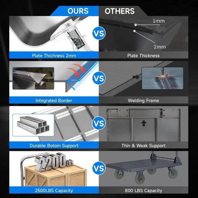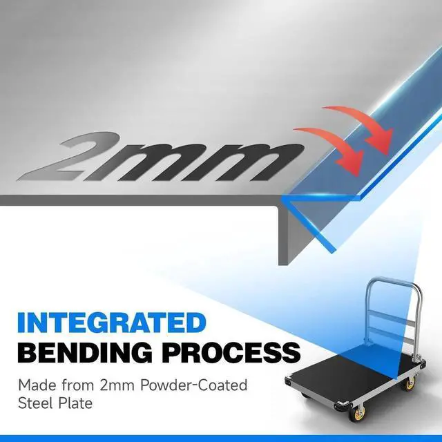 2200 LBS Load Capacity: Crafted from robust 2mm thick steel plates, the platform truck's main body employs integral bending for enduring construction that withstands heavy loads and wear. Engineered with a reinforced bottom support, our platform truck ensures even weight distribution, preventing sagging, and reliably carries substantial loads up to 2200 lbs. Count on this cart for dependable performance, whether it's heavy equipment or bulk items.