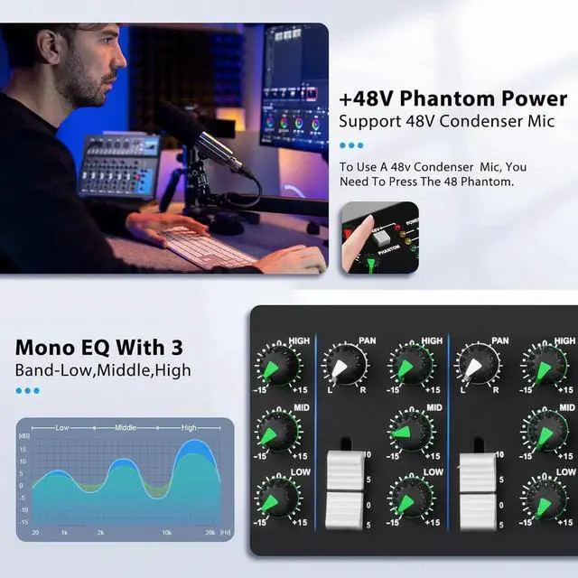 - 3 Band EQ, +48V Phantom PowerEasily adjust the high mid and low frequencies of each channel with the onboard 3-band EQ and gain controls. The mixing board with ultra-musical 3-band EQ on all audio DJ mixer channels to imbue signals with incredible warmth and detailed musical character. The built-in 48V phantom power is suitable for power supply to condenser microphone directly.