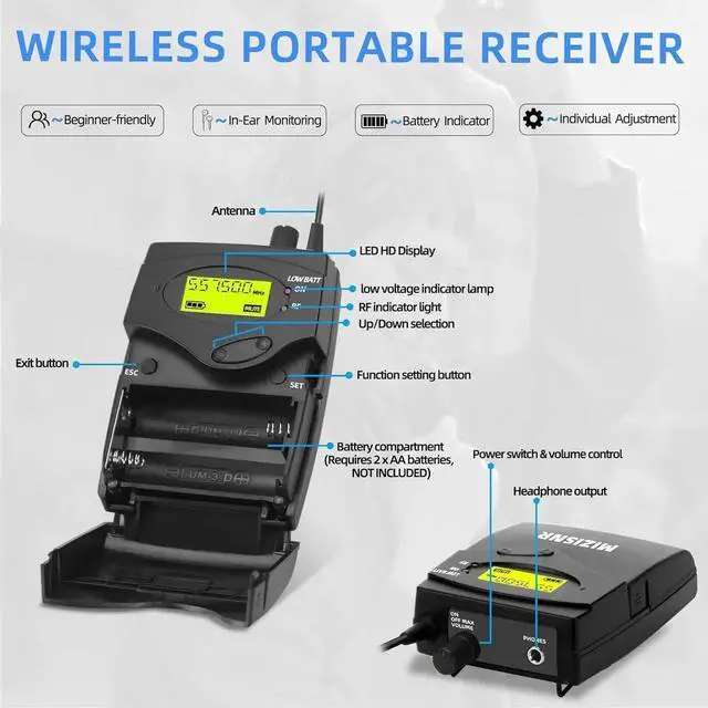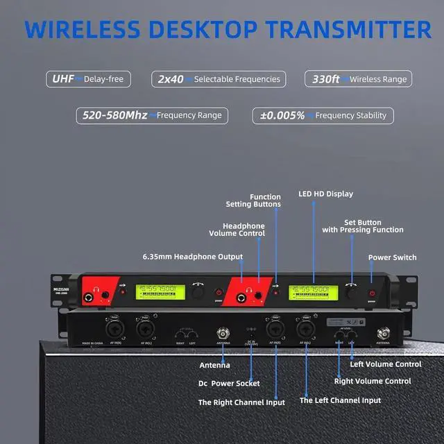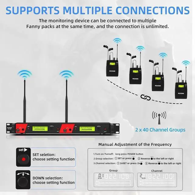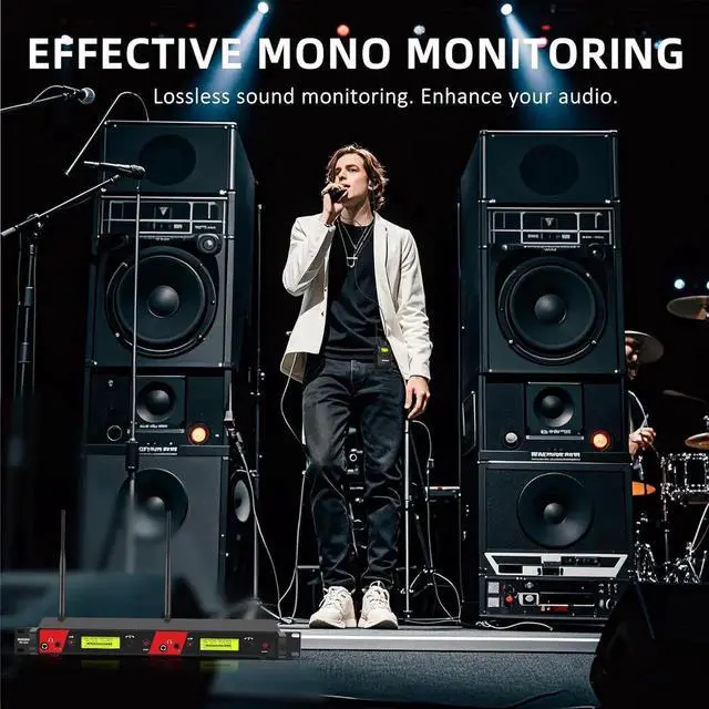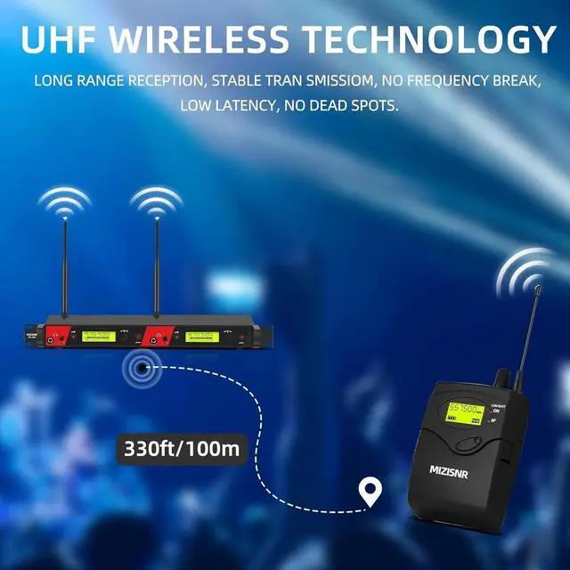UHF Wireless IEM System: The system operates on a UHF band with Phase Lock Loop (PLL) technology, which enhances overall performance by preventing frequency drops and interference. Its built-in limiter circuitry prevents distortion at high input levels, ensuring the signal remains clear and improves the signal-to-noise ratio, providing high-fidelity sound with zero latency while maintaining a stable connection.Flexible Frequency Options: In the 32MHz frequency band, enjoy the freedom to switch seamlessly between the preset 2x40 frequencies for every situation. Frequency range: 520 MHz-580 MHz. The IR sync feature allows you to connect multiple receivers quickly, making setup a breeze. (NOTE: Please avoid thick walls, glass, and metal blocks for longer distances.)