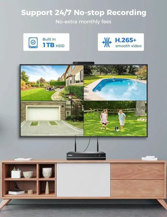 All-in-One, Plug and PlayThe wireless security cameras are auto-paired during factory setup. Simply connect your TV monitor to the NVR using a VGA or HDMI cable, and you can view everything right away. Designed for easy outdoor installation, just plug in the DC12V cord for the camera and secure it in place.Wider 360°+ CoverageThis system includes one fixed camera and one PTZ camera, ensuring comprehensive surveillance from every angle. The dual-camera setup provides two separate views, capturing every detail without blind spotsmaking it a cost-effective choice for security. With an extended 100ft range and advanced WiFi Pro technology, enjoy a stronger and more stable signal. Wireless means support 2.4ghz & 5ghz wifinot wire-free, it needs to plug in DC 12V cord.