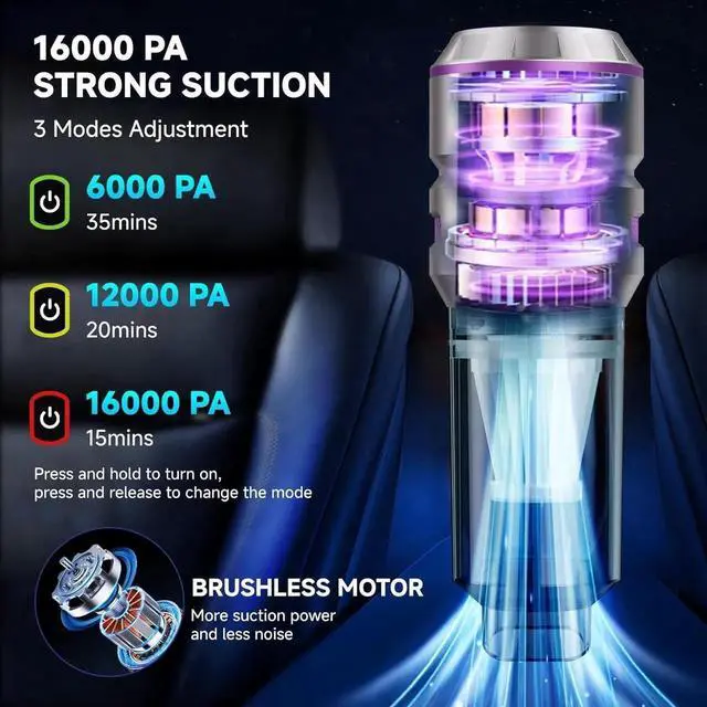 Rechargeable Battery and Fast ChargingThe hand held vacuum cordless cleaner has a built-in 6000mAh battery with a fast charging port, and can be used for about 35 minutes. It supports type C charging and can be easily charged with a car charger, mobile power, laptop, rechargeable battery and other methods, quickly fully charged in 4 hours with 5V/2A adapter.