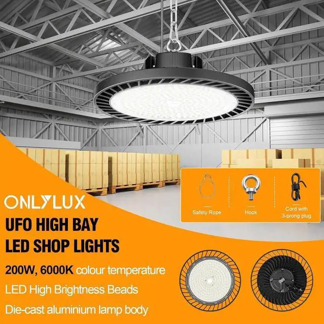 High Quality Light Source:The LED High Bay Light 200W has high quality and powerful SMD3030 LED chips.Its brightness provides 30000lm. Constructed to last 50,000 hours of lifetime which means you won't have to worry about these commercial bay lighting needing a replacement always.falseLatest Design:Adopt heavy die-cast aluminum housing, these high bay led lights have been upgraded to narrow down the space in middle, making the glow more uniform and no dark area. Aluminum body cyclone design, which is perfect for heat dissaption in order to extand the lifetime.falseWide Application:Trust in the durability and reliability of this UFO lights led.It can be put in garages, workshops, barn, gymnasiums, factories, exhibition halls, shopping malls, supermarkets, storage yards, basements and any other large commercial and industrial places.false