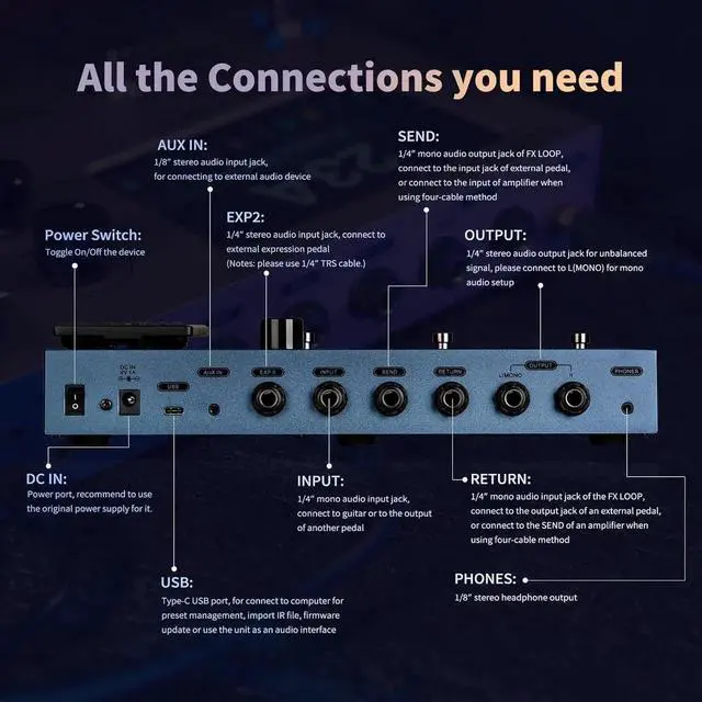 FX150 Multi Effects Processor Electric Guitar Pedal with Amp Modelling Cabinet Simulation Global EQ Touchscreen 160 Built-in Effects 180 Editable User Effects Slots Looper Main I/O Ports