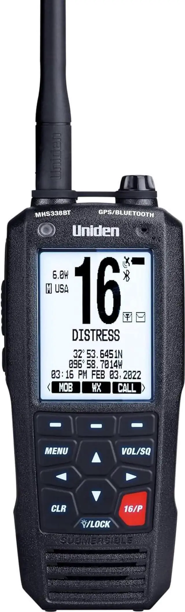 The Uniden MHS338BT is a rugged handheld Marine radio that is rated IPX8 submersible and designed to float. Water activated emergency strobe light and flashlight. Drop-in charging cradle and Li-ion rechargeable battery. Automatic Backlight Switching, white for daylight, amber for night. Integrated GPS, NOAA weather alerts and FM radio, its easy to stay connected and alertFull 6 WATT TRANSMIT POWER- Transmits at full power to ensure maximum range. High/LO power level select lets you boost the transmitter power from 1.0W to 2.5W to 6.0W for added transmission distance. GPS (Favorite Position mode). Lets you save your current position as well as manually enter other positions. You can save positions into a directory to return to them as desired